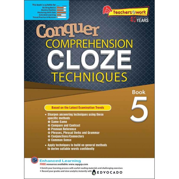 Conquer Comprehension Cloze Techniques Book 5 เป็นหนังสือแบบฝึกทักษะภาษาอังกฤษที่ออกแบบมาเพื่อพัฒนาความสามารถในการทำข้อสอบ Comprehension Cloze ซึ่งเป็นส่วนหนึ่งของข้อสอบภาษาอังกฤษระดับประถมศึกษา โดยเฉพาะการสอบ PSLE หนังสือเล่มนี้มุ่งเน้นการฝึก เทคนิคการวิเคราะห์ข้อความและการเลือกคำที่เหมาะสมเพื่อเติมในช่องว่าง โดยไม่มีตัวเลือกคำให้