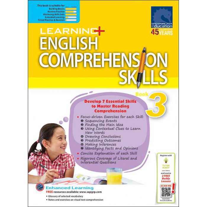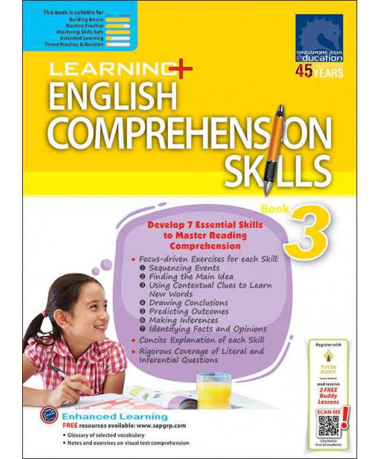LEARNING+ ENGLISH COMPREHENSION SKILLS Book 3 is written to help students develop important comprehension skills that will lay the foundation for a better understanding of comprehension passages and the ability to answer literal and inferential questions.