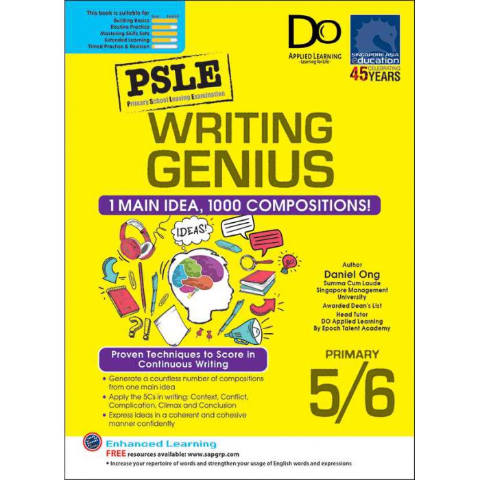 WRITING GENIUS PRIMARY 5/6 summarises the 1 Main Idea To Write 1000+ Compositions Approach that Teacher Daniel relies on in his classroom to guide his students to achieve their targeted scores for Paper 1 Continuous Writing, a trusty companion when preparing for Paper 1 Continuous Writing examinations in primary school.