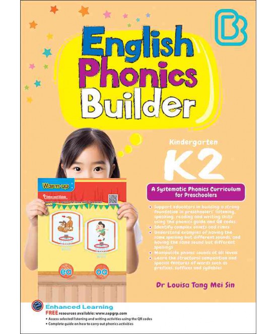 English Phonics Builder K2 helps develop learners’ phonological awareness through phonics. Learners learn the letter names and letter sounds of the English alphabet first before they go on to recognise different onsets and rimes. Numerous fun learning activities allow learners to master the techniques of how to blend sounds and segment words. Learners then proceed to learn syllables, prefixes and suffixes of English words which will help them to prepare for the primary English curriculum.
