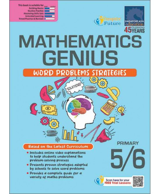 Mathematics Genius: Word Problems Strategies Primary 5/6 เป็นหนังสือฝึกทักษะการแก้ โจทย์ปัญหาคณิตศาสตร์ (Math Word Problems) สำหรับนักเรียนระดับประถมศึกษาปีที่ 5–6 ตามแนวหลักสูตรคณิตศาสตร์ของประเทศสิงคโปร์